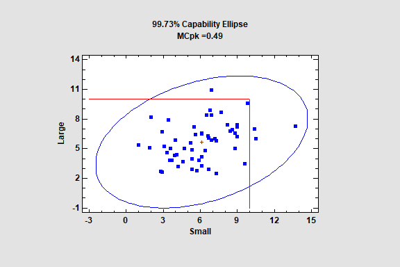 The Multivariate Capability Analysis procedure determines the probability that items characterized by two or more variables meet established specifications limits. When variables are correlated, it is important to consider their joint behavior, since looking at each variable separately may give a misleading picture of the overall process capability.