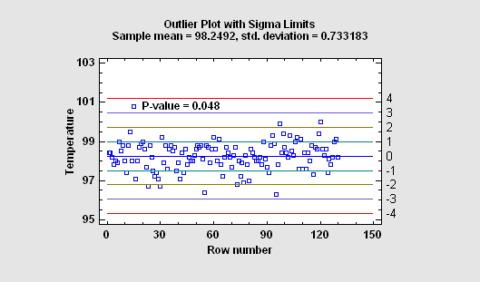 The Outlier Identification procedure is designed to help determine whether or not a sample of n numeric observations contains outliers. Outliers are observations that do not come from the same distribution as the rest of the sample. Both graphical methods and formal statistical tests due to Grubbs and Dixon are included. The procedure will also save a column of flags identifying the outliers in a form that can be used to exclude those observations when running other procedures.
