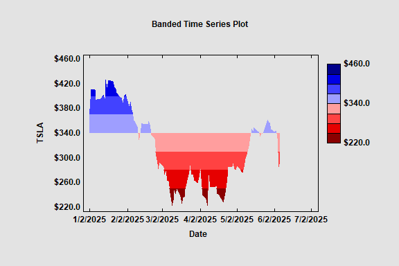A Banded Time Series Plot displays a time series with color coded bands. There are a selected number of bands above a specified centerline and the same number of bands below the centerline. A monochromatic palette is used to display any values that fall within the bands. The plot below shows closing prices of TSLA common stock.