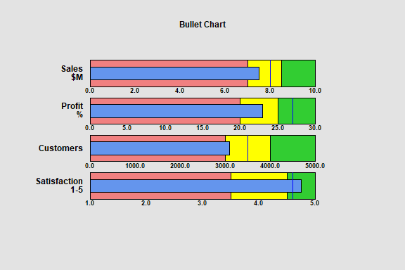 Bullet charts are a special type of barchart that are commonly used to display the performance of a process with respect to multiple