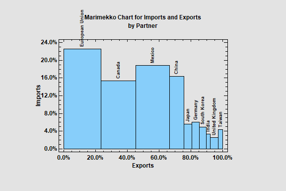 The first example shows the percentage of import (height of the bars) and exports (width of the bars) for the U.S.A. during 2024 for each of its largest trading partners.