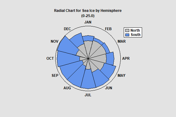 The second type of radial barchart draws bars in the radial direction. The plot below shows the amount of sea ice for each month of 2022 in both the northern and southern hemispheres. Such a chart works well for seasonal data.