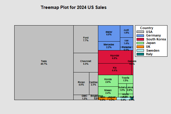 factor being a subset of a parent factor. The area of each rectangle is proportional to the sales of a particular EV in the U.S. during 2024. The models are grouped by country.
