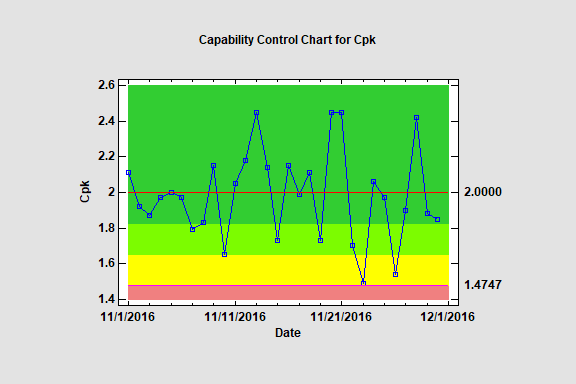 This procedure constructs Phase II statistical process control charts for monitoring capability indices such as Cp and Cpk. Given a process that is deemed to be capable of satisfying stated requirements based on the analysis of variable data, these charts monitor continued compliance with those requirements.
