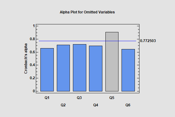 The major output of the procedure is Cronbach’s alpha. Alpha may be calculated directly from the input variables, or the variables may first be standardized so that they have equal variances. The effect on alpha when each variable is separately omitted is also estimated, so that unreliable questions can be identified.