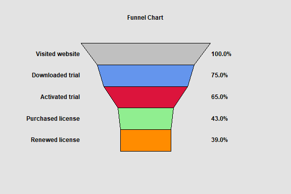 The Funnel Chart procedure creates a special type of barchart that is commonly used to display how a numeric value changes over sequential stages of a process. Examples include stages of purchasing a product on a website and recruiting of new employees. Funnel charts are commonly added to dashboards.
