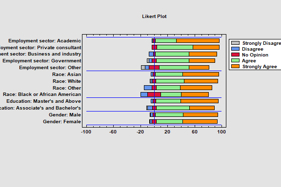 The Likert Plot procedure analyzes data recorded on a Likert scale. Likert scales are commonly used in survey research to record user responses to a statement. A typical 5-level Likert scale might code user responses ranging from 1 for strongly disagree to 5 for strongly agree. The analysis calculates summary statistics and displays the results using a diverging stacked barchart.
