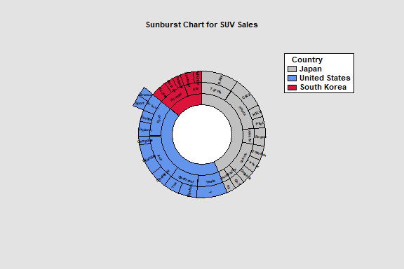 The Sunburst Chart procedure is designed to display hierarchical data. Such data has a parent-child relationship, with each level of the child factor being a subset of a parent factor. The procedure handles data with up to 10 factors.