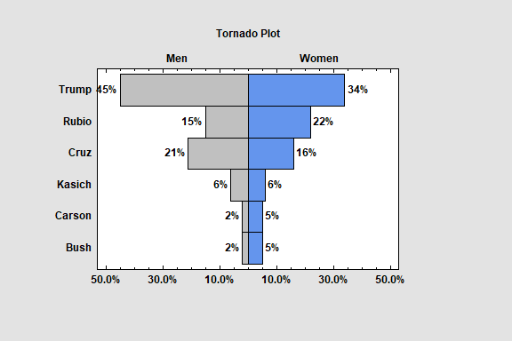 The Tornado and Butterfly Plots procedure creates two similar plots that compare 2 samples of attribute data. Each plot consists of 2 sets of bars that show the frequency distribution of each sample over a set of categories. The only difference between the plots is where the labels are placed.