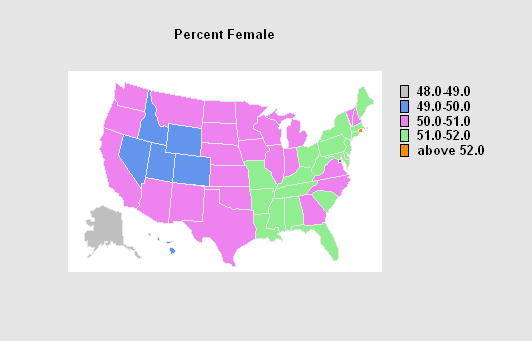 The Map by State procedure creates a plot of the United States on which each state and the District of Columbia are color-coded according to the value of a selected attribute or variable. A table is also created summarizing the number of states falling in each group. If a weighting factor is specified, the sum of the weights in each group is also displayed.