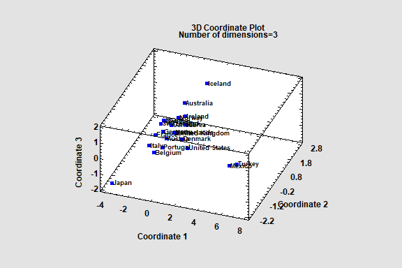 dimensional space. Given an n by n matrix of distances between each pair of n multivariate observations, the procedure searches for a low-dimensional representation of those observations that preserves the distances between them as well as possible. The primary output is a map of the points in that low-dimensional space (usually 2 or 3 dimensions).