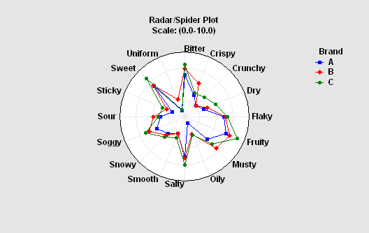 A radar or spider plot is used to display the values of several quantitative variables on a case-by-case basis. The plot at the left compares characteristics of 3 different brands.