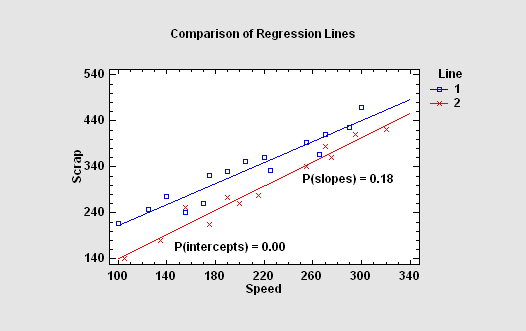 In some situations, it is necessary to compare several regression lines. Statgraphics will fit parallel or non-parallel linear regressions for each level of a "BY" variable and perform statistical tests to determine whether the intercepts and/or slopes of the lines are significantly different.