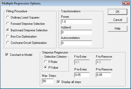 The Multiple Regression procedure fits a model relating a response variable Y to multiple predictor variables X1, X2, ... . The user may include all predictor variables in the fit or ask the program to use a stepwise regression to select a subset containing only significant predictors. At the same time, the Box-Cox method can be used to deal with non-normality and the Cochrane-Orcutt procedure to deal with autocorrelated residuals.