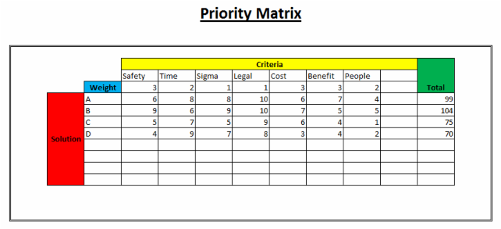 A Priority or Prioritization Matrix is used to help choose between alternative solutions. Given a set of criteria, each solution is scored against each criterion and the weighted sums for the solutions are calculated. The solution with the highest scores is judged to be most capable of meeting the criteria.
