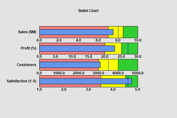 The Bullet Chart procedure creates a special type of barchart that is commonly used to display the performance of a process with respect to multiple features. The chart displays the current status of each feature and compares it to a target value. Often, the bars are divided into three regions corresponding to poor, average or outstanding performance. Bullet charts are commonly added to dashboards, since they provide an easily comprehendible summary of multiple features.