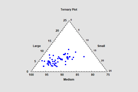 The Ternary Plot procedure may be used to create a scatterplot of 3 variables which always sum to a constant value. It shows the values of the variables on a plot shaped like an equilateral triangle. It is sometimes called a simplex plot or a de Finetti diagram. A common use in physical chemistry is to display the relative proportions of 3 components in samples of a mixture.